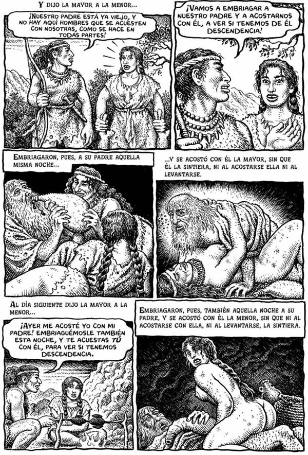 Hablamos de Crumb, es decir, de uno de los padres fundadores de la mirada underground que renovó sin miramientos el lenguaje del cómic a partir de los años sesenta del pasado siglo. Y hablamos del Génesis, una de las fuentes de todas las fuentes. La combinación de estos dos elementos puede parecer chocante, pero no lo es en absoluto. R. Crumb es un defensor del naturalismo, un tanto manierista si se quiere. Y si algo es propio de la literatura del Génesis es precisamente lo mismo, un naturalismo aquí exageradamente manierista. Es como si este primer libro sagrado de nuestra historia hubiera estado esperando a que la plumilla de Crumb desvelara sus secretos al gran público.