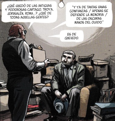 Releyendo Las oscuras manos del olvido he encontrado la fuente exacta de Francisco de Quevedo de donde procede el título elegido por Hernández Cava para su historieta. No se trata de un soneto, sino de una silva de treintayocho versos incluida en Un Heráclito cristiano, Canta a Lisi y otros poemas, del poeta conceptista. Lo curioso es que en la plancha 36 del cómic, página 38 del tebeo de Norma, un personaje cita los versos quevedianos de esta silva que contienen el título del álbum: