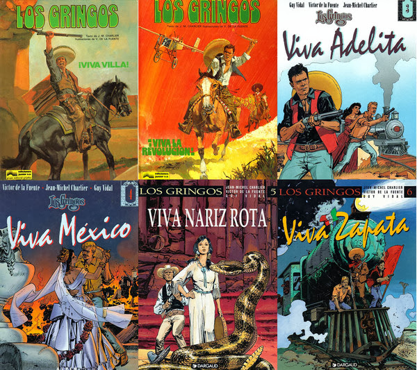 Una vez más, Charlier inició la serie, pero no la culminó. De los seis episodios que componen Los Gringos, solo escribió los dos primeros (Viva la Revolución y Viva Villa). Posteriormente, Guy Vidal se ocupó de guionizar los cuatro restantes (Viva Adelita, Viva México, Viva Blueberry y Viva Zapata). Del dibujo y la ilustración de la serie completa se encargó De la Fuente.