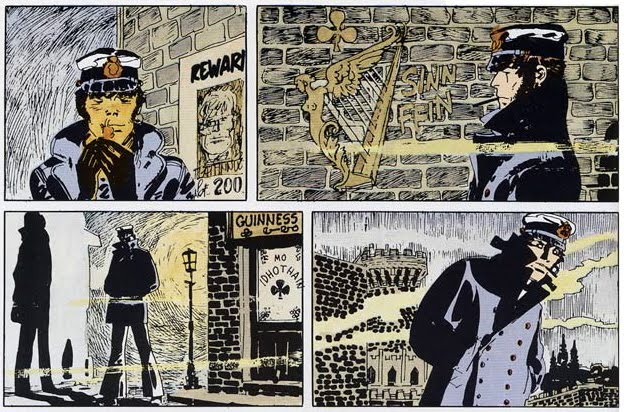 No diré que «Concierto para arpa y nitroglicerina» sea una simple ilustración del cuento de Borges, cosa de por sí más que ardua. Lo que hizo Hugo Pratt fue cambiar los personajes y la época de los hechos narrados y simplificar esa historia despojándola del barroquismo formal borgesiano, aunque mantuvo el lugar, el ambiente y el motivo de las acciones en juego: la lucha del pueblo irlandés contra el opresor británico.