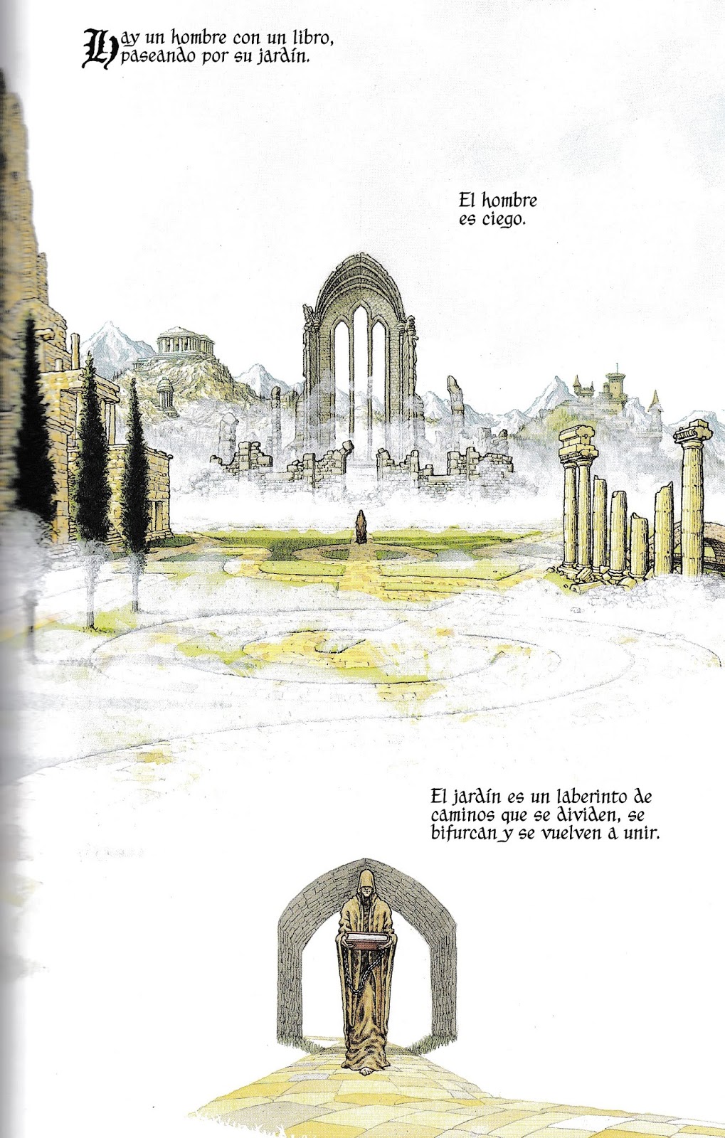 Destino es el hermano mayor de los Eternos. Está ciego, como le corresponde a su ser. Acarrea un pesado libro al que está encadenado y que lee con asiduidad (su ceguera le permite acceder a los contenidos invisibles que atraviesan las letras). Absolutamente borgesiano, pasea leyendo su libro por un jardín de senderos que se bifurcan y forman un laberinto que de nuevo se unifica. La sombra de Destino le imprime a la narración de Gaiman un aire spinozista en ocasiones, sobre todo cuando se sugiere que lo que perece o muere no es sino una manifestación de una única sustancia eterna. Así, por ejemplo, Morfeo sucumbe necesariamente, pero la nueva presencia de Sueño lo sustituye en sus dominios.