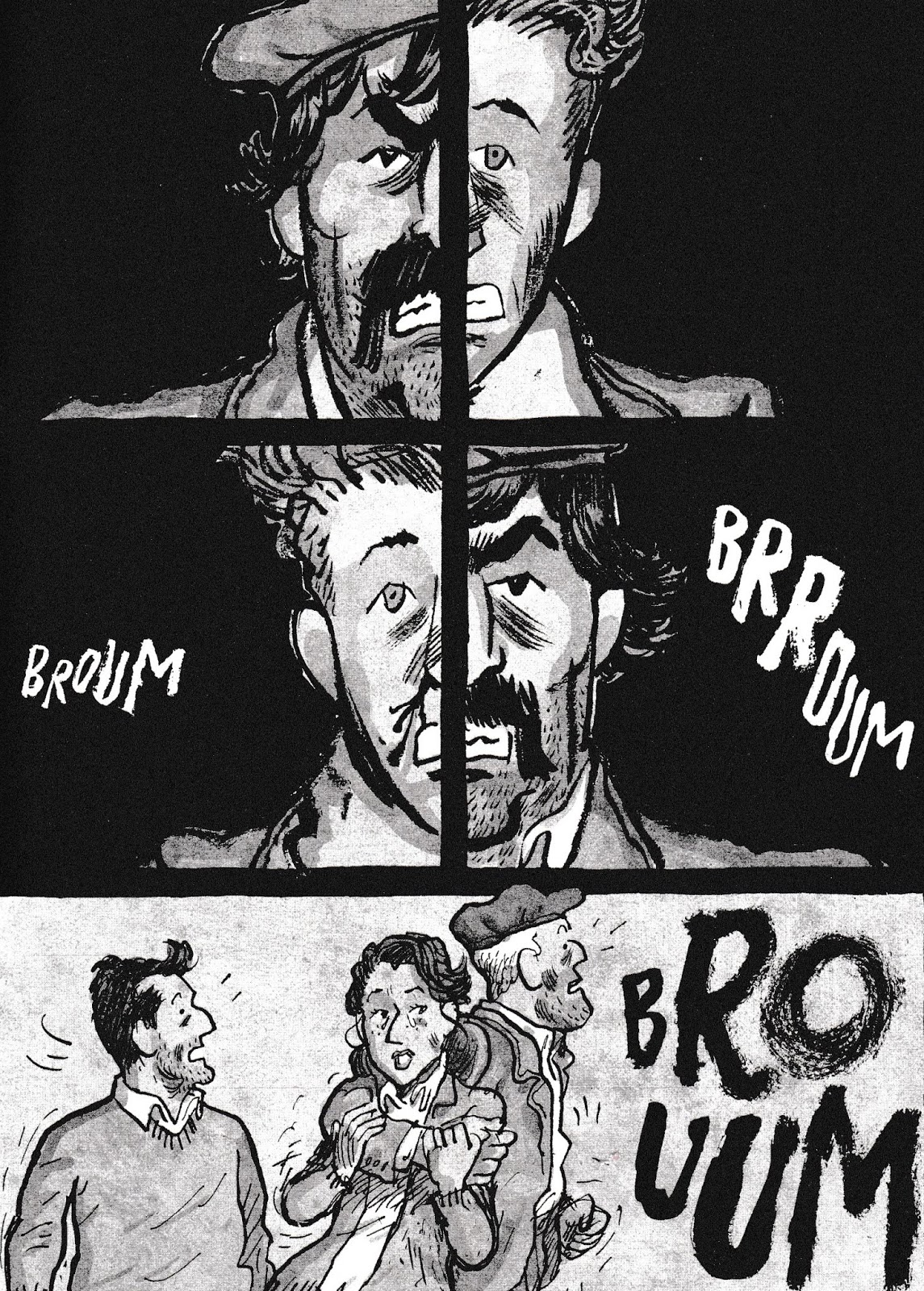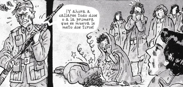 Las onomatopeyas y los símbolos cinéticos son otra marca específica de los tebeos en sentido propio. Especialmente las primeras abundan en este volumen, en consonancia con el carácter bélico que predomina en sus páginas. Pese a la seriedad y el rigor histórico con que Zapico afronta una narración ambientada en la Revolución asturiana de 1934 (al paso que narra esa misma Revolución), el autor es muy consciente del medio que está utilizando, el de la historieta. Y se muestra absolutamente fiel a los recursos de este medio. Lo más significativo es el modo en que Zapico nos convence al demostrar que los recursos del cómic clásico, incluida la caricatura, son perfectamente válidos para describir el horror y la crueldad realmente dados, con sustancia histórica, más allá de la ficticia y tonta crueldad, como de chicle, que se percibe en las viñetas de un Ibáñez, p. e. Quiero decir que Zapico pone el lenguaje de la historieta al mismo nivel que el lenguaje de las narraciones o de las novelas históricas, con toda su carga dramática. Y lo hace empleando ese lenguaje gráfico con la propia frescura que lo acompaña desde sus orígenes. No es poco el servicio que mediante esta estrategia le presta Zapico al cómic, a su consideración y valoración. Es la misma estrategia con la que el autor asturiano acometió, de manera exitosa, otros títulos como Café Budapest, Joyce o Los puentes de Moscú. El tebeo se revalida como un medio idóneo para exponer los conflictos reales, tanto del presente como del pasado. Sin necesidad de edulcorar innecesariamente, pero sin dejar por ello de ser tebeo.