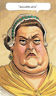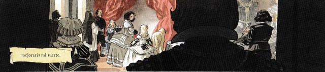 La atmósfera entretejida de actitudes sesgadas y miradas oblicuas, sugerida por la óptica metapictórica que tan bien configuran Santiago García y Javier Olivares en su novela gráfica Las Meninas (2014) ―a lo que me he referido [aquí] mediante la fórmula «la representación de la representación»―, sirve para iluminar la confección, pero también la lectura de El Buscón en las Indias. El espacio cortesano y las figuras que sustancian la pintura Las Meninas cobran forma en el Prólogo y en el Epílogo del tebeo de Ayroles y Guarnido. Son así la cabeza y la cola de un relato florido (si se me permite el adjetivo) que no es que no decaiga, sino que crece. En medio, el cuerpo de la narración enmarcada como en un cuento maravilloso. Lejos queda la aventura del pícaro Pablos en Perú respecto a la emprendida por Lope de Aguirre en su búsqueda de El Dorado, ya lo hemos dicho. Sin embargo, de algún modo sobrevuela en ocasiones, al contemplar El Buscón en las Indias, la trilogía sobre Aguirre escrita por Hernández Cava, en especial el tomo primero, La Aventura, con dibujos y color de Enrique Breccia, en lo que se refiere al aspecto formal. No obstante, la cosa queda ahí. La locura trágica de Lope de Aguire queda también muy lejos de la trama ajedrecística y picaresca de El Buscón… La esplendorosa luz de Guarnido rinde tributo a una historia que participa del humor de por ejemplo El día de los tramposos, la película de J. L. Mankiewicz (There Was a Crooked Man, 1970), aunque en mi opinión va más allá en la medida en que se entrelaza con el devenir de la Historia de España. Poco más se puede decir de este magnífico guion sin destripar su final a estas alturas del estreno de la obra, tan reciente. Me conformaré con lo que sugiera el título de este apunte que no pretende ser más que eso, un apunte respecto a una obra de tantísima vastedad y tan rica en matices como el espacio y el tiempo que la acogen.