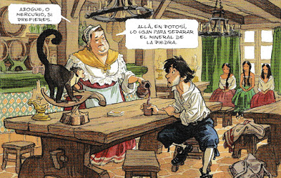 Las Indias referidas las concentran Ayroles y Guarnido en el virreinato de Perú, un espacio atravesado en aquel siglo por una quimera, la de El Dorado, que operaba a la vez como sinécdoque ilusoria de aquel país y como metáfora ensoñadora de una época. Pero no es la búsqueda de El Dorado lo que mueve la acción de El Buscón en las Indias. Lo que busca Pablos es la fortuna, y, si bien El Dorado desempeña un papel importante en la trama del tebeo, dicha quimera «no es el centro de la historia sino un personaje… un cebo para atraer al lector a la historia y a sus maquinaciones» [tal y como declara el propio Guarnido aquí].