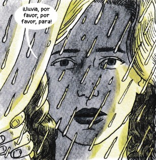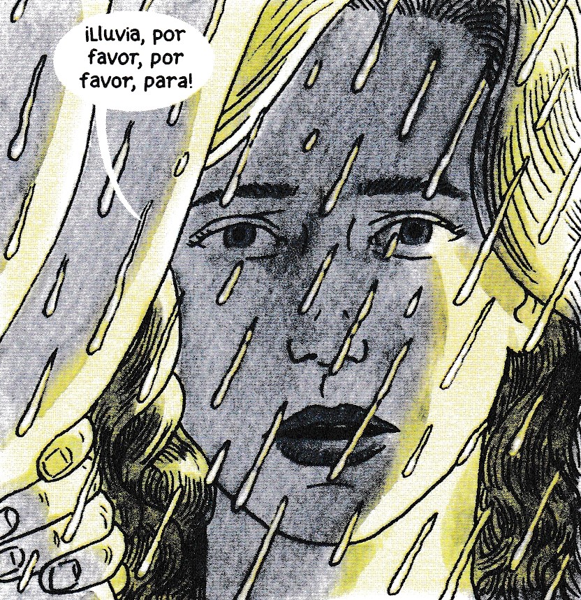 Pero Lluvia no es un mero manifiesto. Es un cómic. Hay en él narración, intriga, acción y pasión. Es una ficción realista que se desenvuelve en una realidad para nada ficticia. Y es aquí donde aparece otra importante característica de este relato. A diferencia de lo que ocurre en sus trabajos anteriores, enmarcados en el siglo pasado (La niña de sus ojos, Sally Heathcote) o el anterior (La virgen roja), en Lluvia nos encontramos plenamente inmersos en el siglo XXI, con todas las novedades ―en lo telemático, en las relaciones interpersonales y amorosas, en lo medioambiental― que el nuevo siglo comporta. La cosa tiene su mérito, dado que Bryan y Mary Talbot pertenecen a la generación que coreaba canciones como «A cántaros», de Pablo Guerrero, y sin embargo manifiestan una sensibilidad exquisita para recoger el entorno, los anhelos y desideratas de una generación posterior (dedican el volumen a sus nietos). El hecho de que los personajes principales de Lluvia, igual que en sus otros títulos en colaboración (además de en El cuento de una rata mala) sean femeninos es una marca distintiva del arte comprometido de los Talbot.