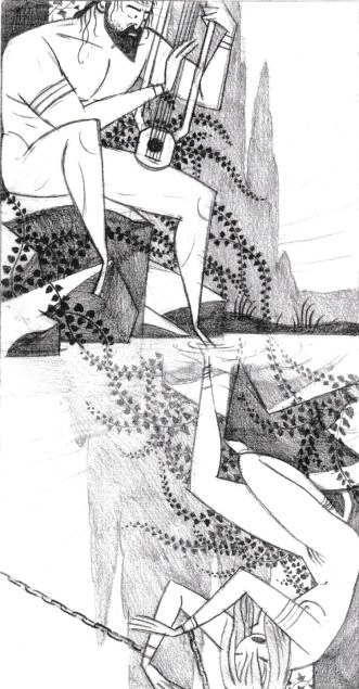 Poema en viñetas (Poema a fumetti, 1969) es una versión contemporánea del mito de Orfeo y Eurídice, ambientada en el Milán de la época de Buzzati y fiel a la estética de esa misma época. Aquí Orfi es un cantante que baja al inframundo urbano en busca de su amada Eura, y el arte de Dino Buzzati se manifiesta en el hecho de que el texto y los dibujos del autor italiano se engarzan de un modo que recoge fielmente el espíritu de la leyenda tradicional. El caso es que la lectura de Poema en viñetas me activó el recuerdo de la historieta de Neil Gaiman, dibujada por Bryan Talbot, titulada «La canción de Orfeo» (1993) e incluida en la serie The Sandman. Gaiman concibe a Orfeo como hijo de Morfeo, pero en lo demás es bastante fiel al legado tradicional del mito. Posteriormente, buceando en la red, encontré un artículo firmado por Ramiro González Delgado: Orfeo y Eurídice en el cómic, que a su vez añade a los dos cómics anteriores Katábasis, una breve historieta de Max que forma parte de su libro Órficas (1994). Yo conocía Katábasis como una de las cinco historietas de Max que integran su álbum Como perros! (1995), pero no había abordado la fuente original a la que pertenece, esto es, Órficas. Esta fuente es el libro-catálogo de una exposición que la Diputación de Sevilla encargó en su momento a Max. Consta de tres partes; la central la ocupan las diez páginas en cómic de Katábasis; la final, el texto en italiano y en español de L’Orfeo, la ópera de Monteverdi estrenada en 1607; la primera parte de Órficas, en fin, titulada «El texto de Epiménides», es una composición literaria de Max salpicada de fragmentos y citas de escritores, mayoritariamente de la Antigüedad clásica ―salvo alguna excepción―, todos ellos referidos a la leyenda de Orfeo y contrastados con ilustraciones del propio Max. Mi sorpresa al leer «El texto de Epiménides» fue ante una de las excepciones, un poema de Rilke tomado de sus Sonetos a Orfeo (1922), acompañado de la ilustración siguiente de Max: