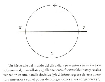 El héroe campbelliano es una aspiración, un constructo ideal que tiene su origen en multitud de observaciones empíricas ―de inscripciones, de representaciones icónicas, de epopeyas y narraciones mitopoyéticas― y en otras tantas síntesis hermenéuticas llevadas a cabo por el autor estadounidense. Es un resultado intelectual, por más que entronque con aspiraciones vitales. Su emblema es el monomito, la aportación formal de Campbell al tratamiento del héroe.