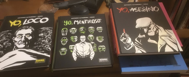 El entrelazamiento entre los tres tebeos que componen la «trilogía del yo» se percibe sobre todo a partir de las respectivas historias que en ellos se cuentan y de los personajes que directa o indirectamente intervienen en ellas. Los entramados de ficción policiaca que articulan cada una de estas historietas las alejan de ser meras constataciones de los entresijos ocultos tras la realidad social. La presencia de agentes y de otros elementos comunes en esos entramados justifica plenamente que se trate de una trilogía (o tal vez tetralogía, si se tiene en cuenta que hay también un cuarto título entreverado con este tríptico: El perdón y la furia, en el que Altarriba y Keko extienden el espacio de la representación establecido previamente por ellos en Yo, asesino). Es cierto que por encima, por debajo, o si se quiere al lado de las tramas de intriga de estos tebeos se encuentran jugosas reflexiones ―un poco a la manera de El príncipe, de Maquiavelo―, como por ejemplo ese debate permanente acerca del significado del arte en relación con su autenticidad. Pero el interés por la intriga en ningún caso queda oscurecido por tales reflexiones, que operan en el texto como una voz interior. El propio Altarriba nos sugiere a la postre que estos apuntes conforman una conversación tan abierta como el final de la intriga que él nos presenta con Keko en la Trilogía del Yo.