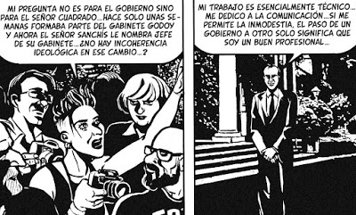 El sentido de la paradoja es bien conocido. Si miento, digo la verdad; pero si digo la verdad, miento. Altarriba y Keko juegan con este sentido en Yo, mentiroso para ilustrar nada menos que los mecanismos de fontanería de la Moncloaca. Este tercer título de la trilogía del yo es muy fiel a las fuentes periodísticas que supuestamente nos informan de lo que sucede en el ámbito de la política en nuestro país. Se revela así una cercanía de esta obra con respecto a Primavera para Madrid. Ambos cómics mienten, en un sentido lato, desde el momento en que los dos, siendo representaciones, plantean situaciones que son figuradas. Pero a la vez son dos tebeos que dicen la verdad, ya que los lectores entendemos íntimamente, por la vía del reconocimiento de personajes y situaciones, el mensaje ofrecido. Queda la duda acerca de si la inmediatez de lo noticioso le pueda restar eficacia a largo plazo a la rotundidad del discurso representado. Es el eterno problema de la validez de las connotaciones. Pero si la denotación está clara, siempre hay algo que permanece en el tiempo. En el caso de Yo, mentiroso, además, se desvela el artificio según el cual en los departamentos de comunicación de las instituciones, bajo el disfraz de un perfil supuestamente «técnico» de su respectivo director, se deciden el alcance y orientación de las informaciones que aparecen en los medios.