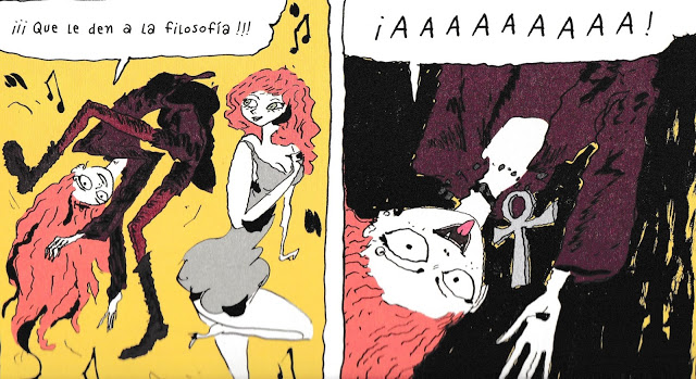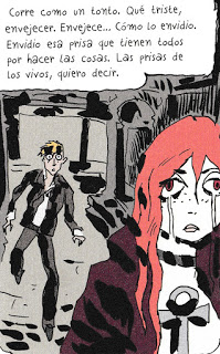 El vitalismo de Aspirina es más diegético, está más inserto en las historietas en las que figura. A diferencia de lo que ocurre con las múltiples representaciones de Muerte, el escritor y dibujante de Aspirina es uno y el mismo. Esta circunstancia, como la contraria, tiene sus implicaciones. Supongo que Joann Sfar ―escritor que dibuja o dibujante que escribe― posee mayor libertad expresiva que Neil Gaiman, en cuanto aquel es más independiente que este (me refiero a la independencia gráfica): los personajes de Sfar pueden evolucionar en sintonía con el trazo directo que él les imprime, cosa que no ocurre con Gaiman, siempre a merced de tantísimos dibujantes. Pero bueno, volvamos con la opción vitalista. Pese a que en alguna viñeta Aspirina denote la tristeza vampírica de quien no puede envejecer,