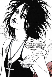 Esta imagen de Muerte realizada por Peter Kuper recoge y refleja a su vez el vitalismo de Muerte. Es un vitalismo que se manifestó en su momento mediante la capacidad de la representación de este personaje para trascender las viñetas e insertarse de pleno en la moda gótica. Así lo demuestra la invasión de merchandising derivado de Muerte durante los años noventa del siglo pasado (la primera edición de TheSandman se dio entre 1988 y 1996). Era como si los jóvenes góticos asumiesen, quizás inocentemente, que es la realidad de la muerte lo que da un significado especial a la vida.